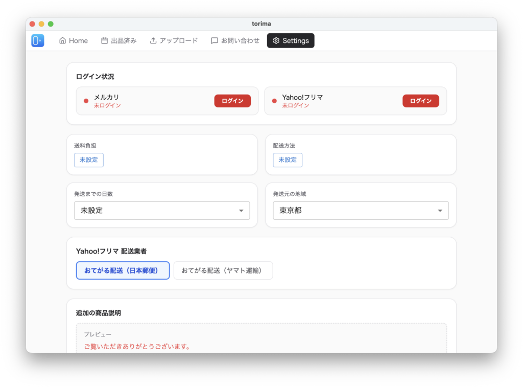 Settingsに移動して、メルカリ、Yahooフリマのログインボタンを押します。