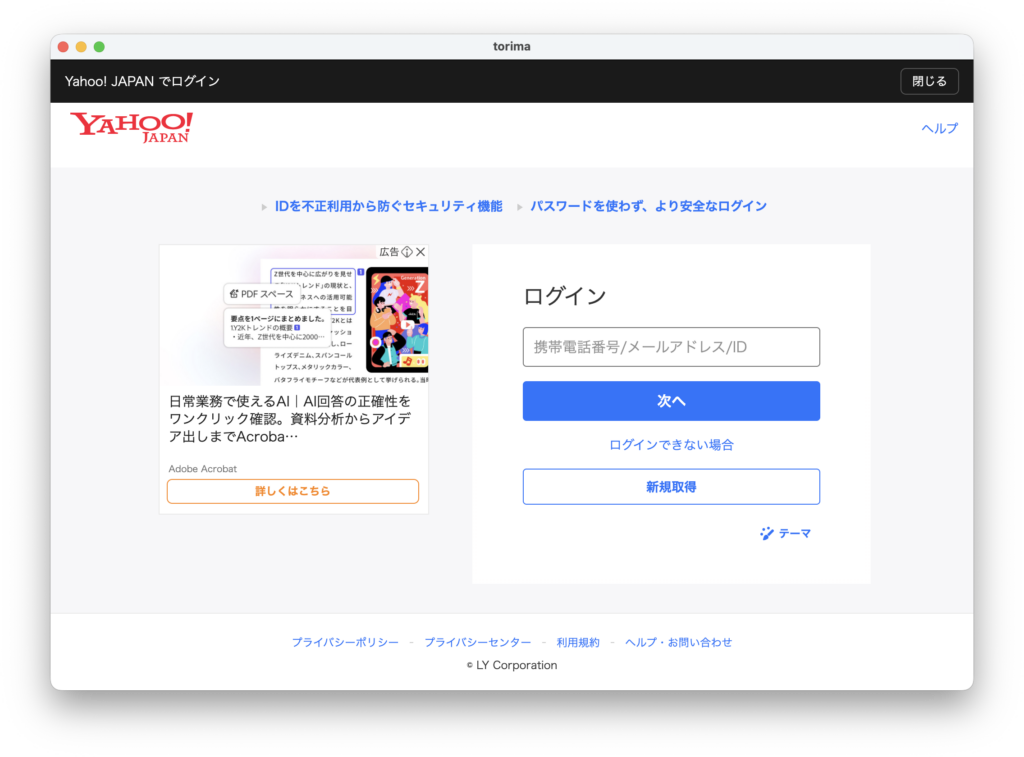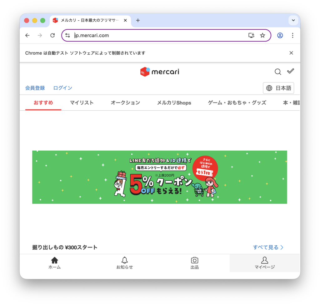フリマアプリのログインボタンを押すと、ブラウザが自動で立ち上がります。