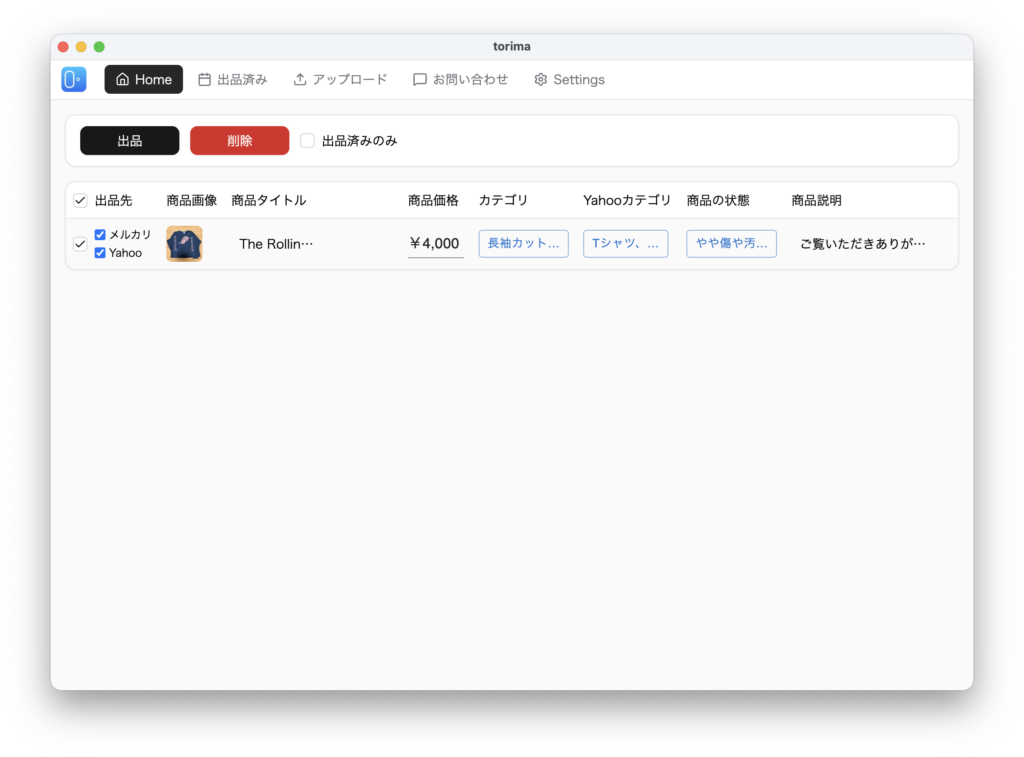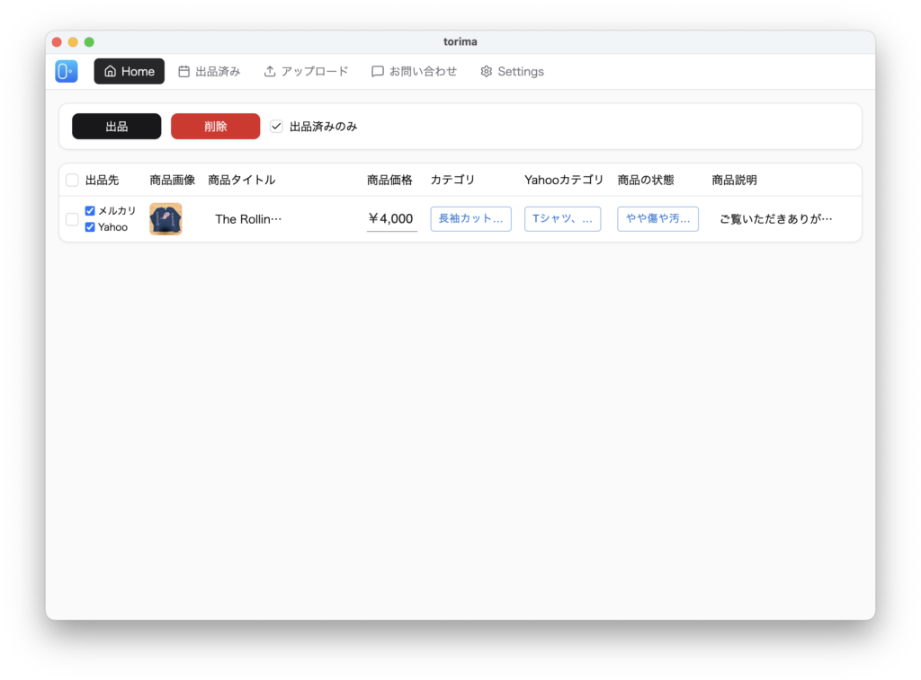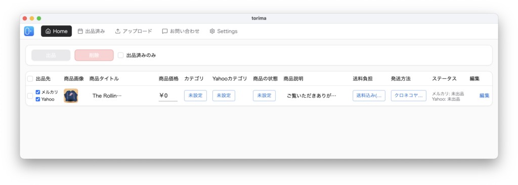 生成された情報を確認し、商品価格・状態・送料負担・発送方法を入力したら、出品したい商品のチェックを入れて「出品」ボタンを押します。